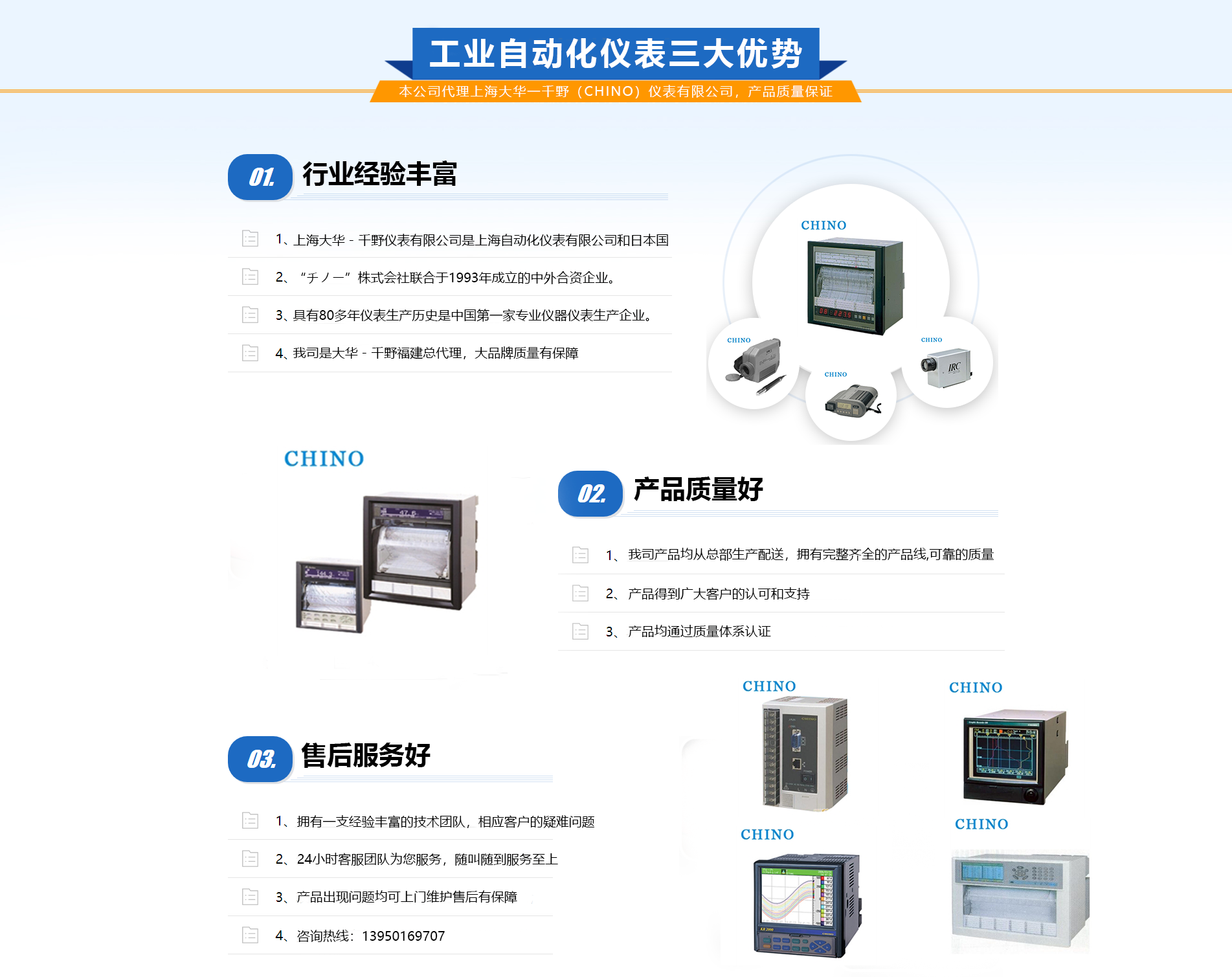 本公司是上海自動(dòng)化儀表有限公司及上海大華一千野(CHINO)儀表有限公司(福建省總代理),主要經(jīng)營(yíng)工業(yè)自動(dòng)化儀表,溫濕度傳感器和記錄儀,兼營(yíng)進(jìn)口、國(guó)產(chǎn)各種品牌的儀器儀表,主要產(chǎn)品以溫度系統(tǒng)的配置為主,確保價(jià)格、質(zhì)量及售后服務(wù)均以用戶(hù)為宗旨。具體產(chǎn)品介紹如下:一、記錄儀、巡檢儀、顯示儀: 1、千野(CHINO)記錄儀、橫河(YOKOGAWA)記錄儀、圓圖記錄儀、長(zhǎng)圖記錄儀、實(shí)驗(yàn)室記錄儀及記錄紙。 2、巡檢儀、數(shù)顯儀、指示儀、指示報(bào)警儀、閃光報(bào)警器,及相關(guān)的備品備件。 二、溫度傳感器和溫度控制器: 1、熱電阻、熱電偶:如WZP-120,WZPK-230,WRS-230等; 2、雙金屬溫度計(jì):如WSS-401,WSS-501等. 3、各種分度號(hào)的補(bǔ)償導(dǎo)線(xiàn). 4、各種品牌的溫度控制調(diào)節(jié)儀:如千野(CHINO)、RKC、 橫河(YOKOGAWA)、山武-霍尼韋爾等。 三、壓力儀表: 1、壓力表、壓力傳感器; 2、各類(lèi)差壓、壓力變送器(橫河EJA,福克斯波羅,羅斯蒙特,上海光華及重慶偉岸等品牌產(chǎn)品...